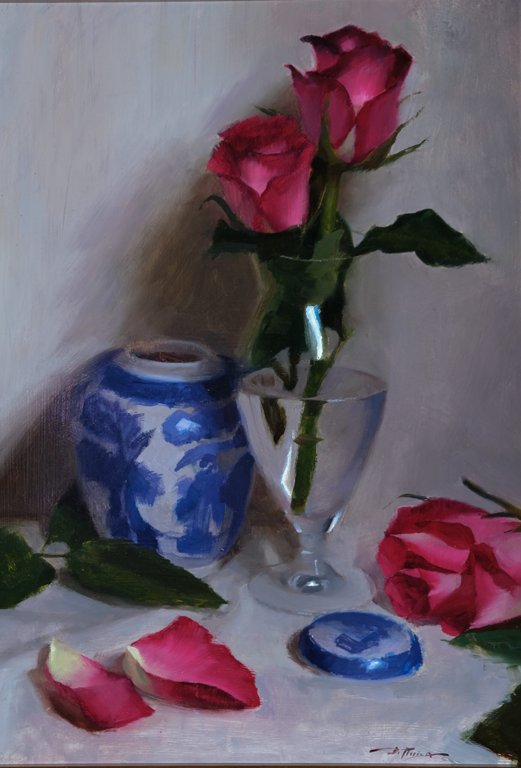 "Red Roses with Delft Blue Pot"